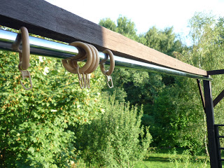 Przed włożeniem rurki z drugiej strony w mocowanie należy nałożyć na rurkę kółeczka. Na zdjęciu są kółka z haczykami, które absolutnie nie wytrzymały próby wiatru. Na moją pergotendę założyłam po sześć kółek prowadzących. Tyle samo co pętelek na materiale.