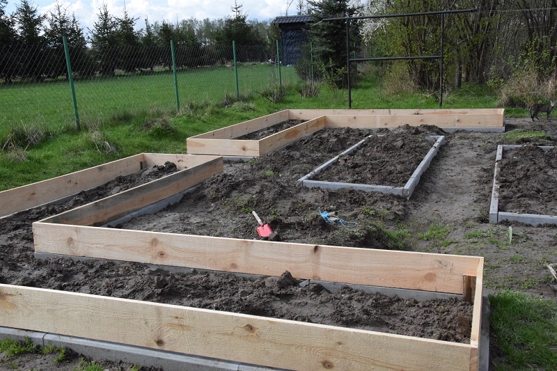 Kolejny etap - budowa drewnianych skrzyń. M kupił deski szerokości 20 cm i taką wysokość zyskaliśmy na naszych grządkach: