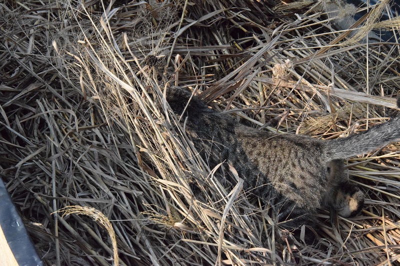 Na kartony ułożyliśmy gałęzie na których powinna znaleźć się słoma. Słomy nie miałam, ale po wiosennym cięciu miskantów miałam takie coś. Mam nadzieję, że efekt będzie podobny