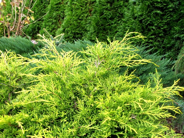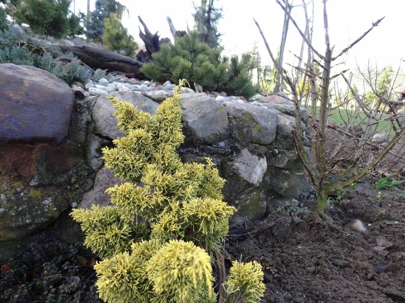 Obok jałowca rośnie cyprysik Lawsona z żółtymi końcówkami igieł. Bardzo do siebie pasują :)