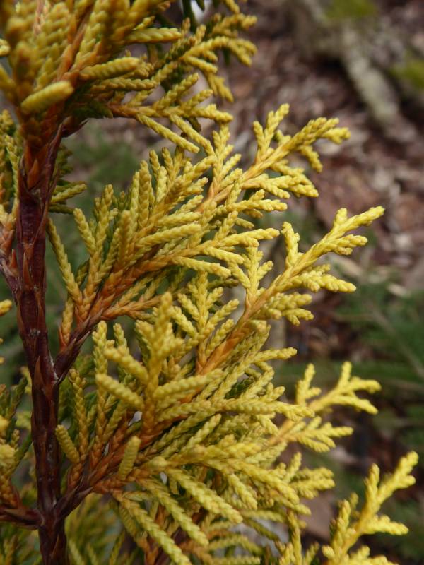 Piękne, jaskrawe wybarwienie prezentuje zimą cyprysik groszkowy 'Filifera Aurea Nana'