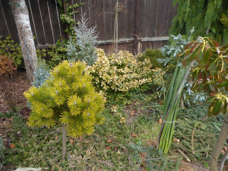 Pinus mugo 'Wintergold', trochę większa kosówka przebarwiająca się zimą. Od trzech lat uszczykuję jej młode przyrosty, dlatego jest taka zwarta.