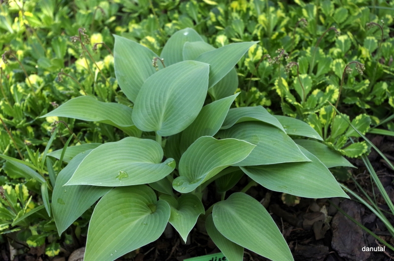 Rozmiar: M wysokość 35-40cm Liście: sztywne,sercowate niebiesko-zielone, na bardziej nasłonecznionych stanowiskach zmieniają się na żółtawo-białe Kwiaty: lawendowe Zalecane stanowisko: półcień/cień Uwagi: