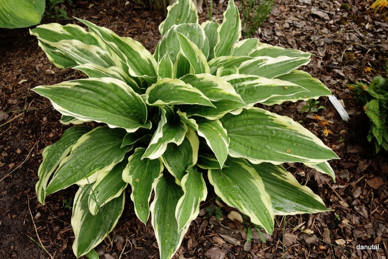 Rozmiar: M wysokośc 45-50cm Liście: sercowate zielone liście z kremowo-białym pofalowanym marginesem i wyraźnym unerwieniem Kwiaty: lawendowe, kwitną w lipcu Zalecane stanowisko: od słońca do cienia