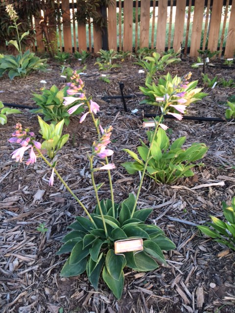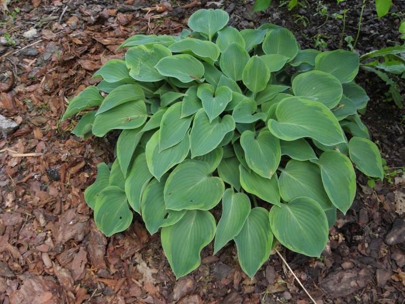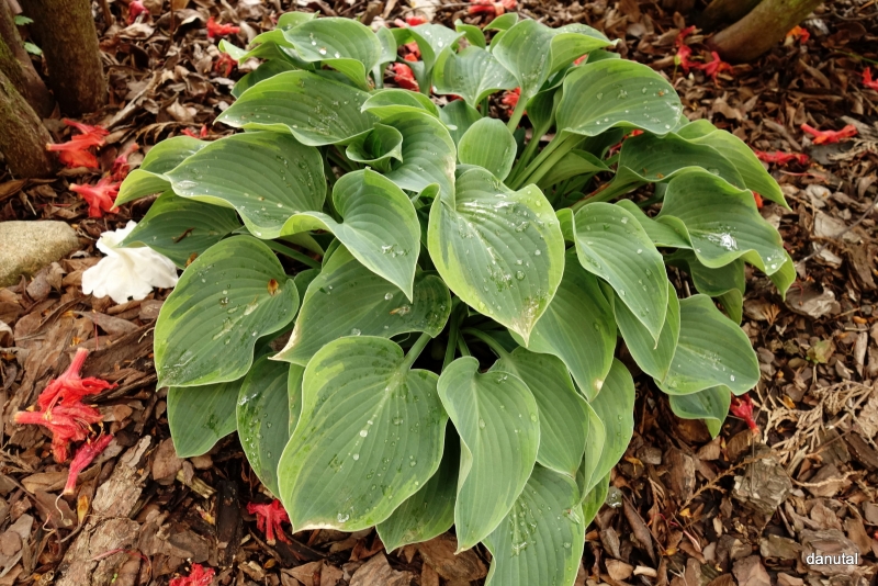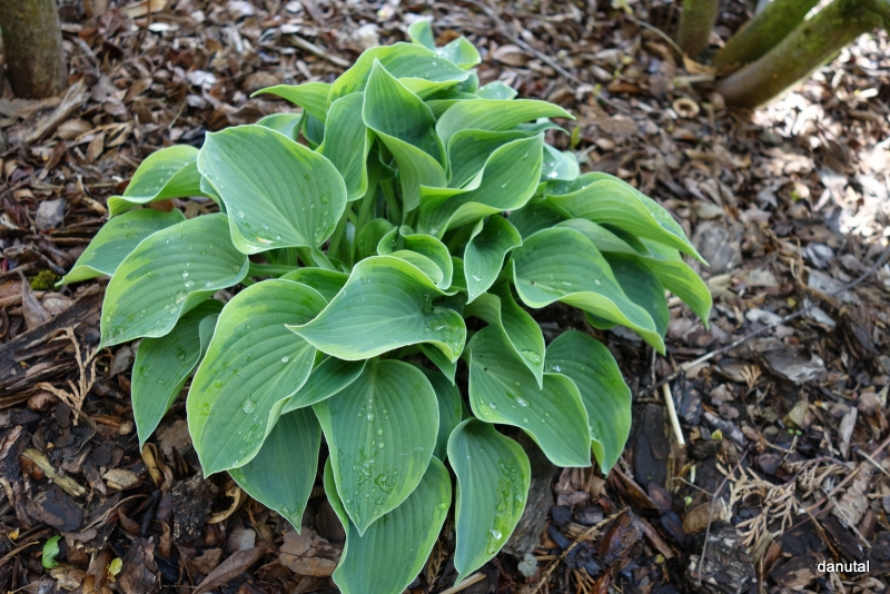 Rozmiar: S/M wysokość 30-35cm Liście: zaokrąglone niebiesko-zielone liście z zielonkawo-żółtym marginesem Kwiaty: lawendowe w czerwcu Zalecane stanowisko: zarówno w słońcu i cieniu Uwagi: