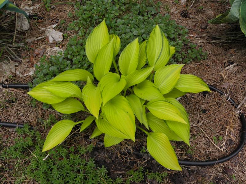 Rozmiar: M (wysokość około 35 cm, szerokość około 70 cm) Liście: spiczasto zakończone, błyszczące, jasnożółte z wąskim zielonym marginesem, który w trakcie sezonu zmienia kolor na kremowo-biały Kwiaty: bladolawendowe Zalecane stanowisko: od słońca do cienia