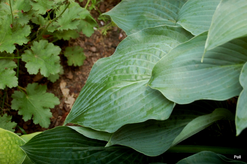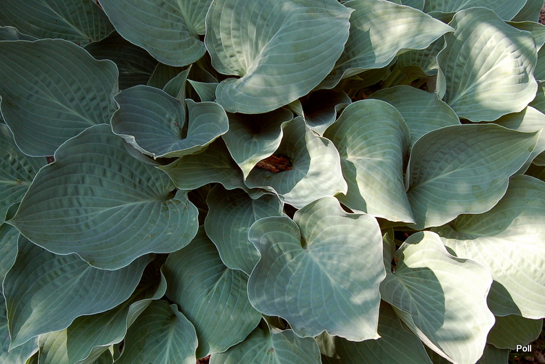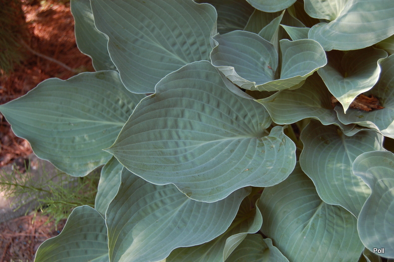 Liście: intensywnie szaroniebieskie, lekko burchlaste ; sercowate o łagodnie falującym brzegu i jaśniejszych, wyraźnych nerwach , bardzo charakterystyczne; przypudrowany back