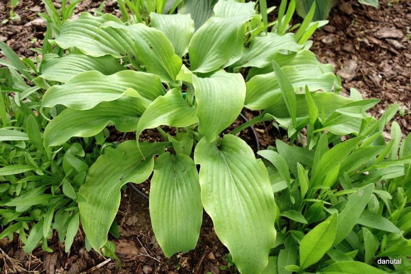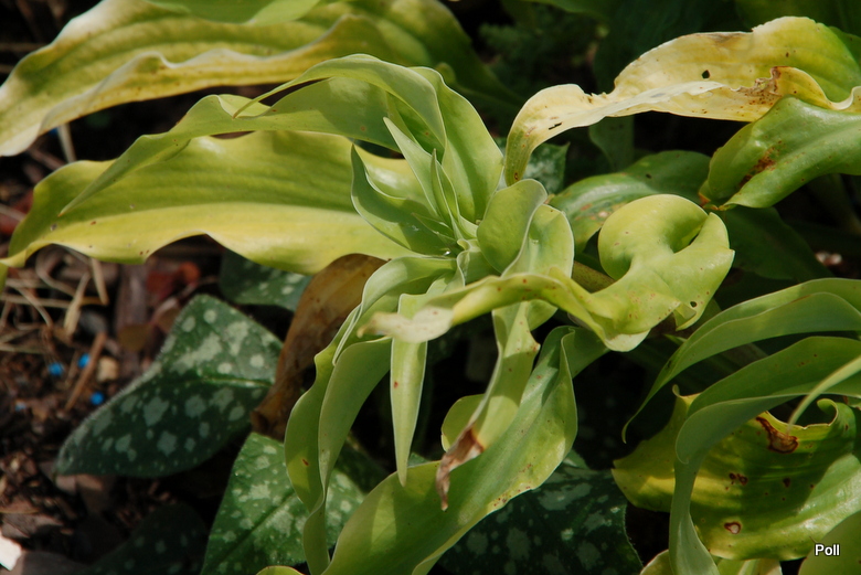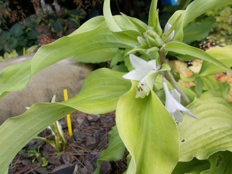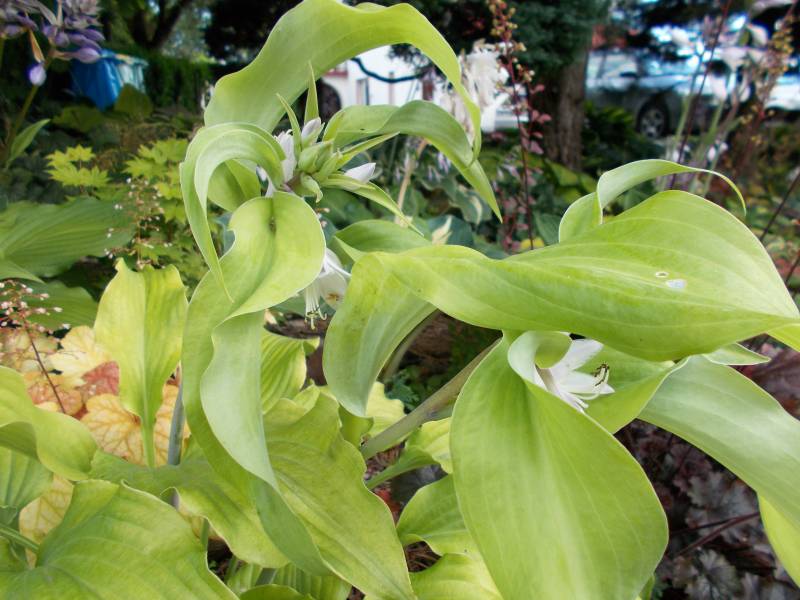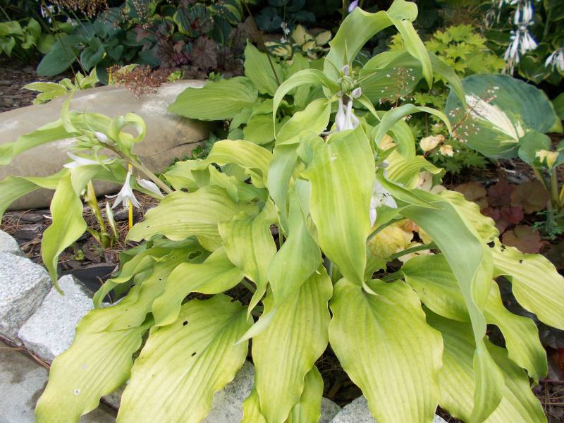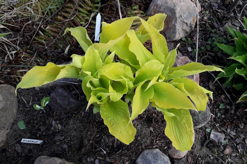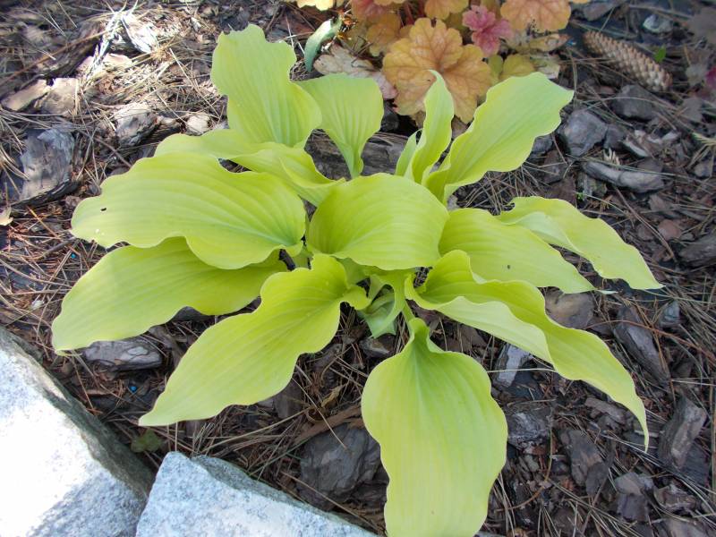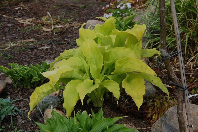 Hosta Lullaby rośnie u mnie w dwóch miejscach, ale przymrozki przetrwała tylko ta, która schowana była za wielkim kamieniem. Wiosną ma ładnego koloru kły i liście - bardzo żółte i ciepłe.