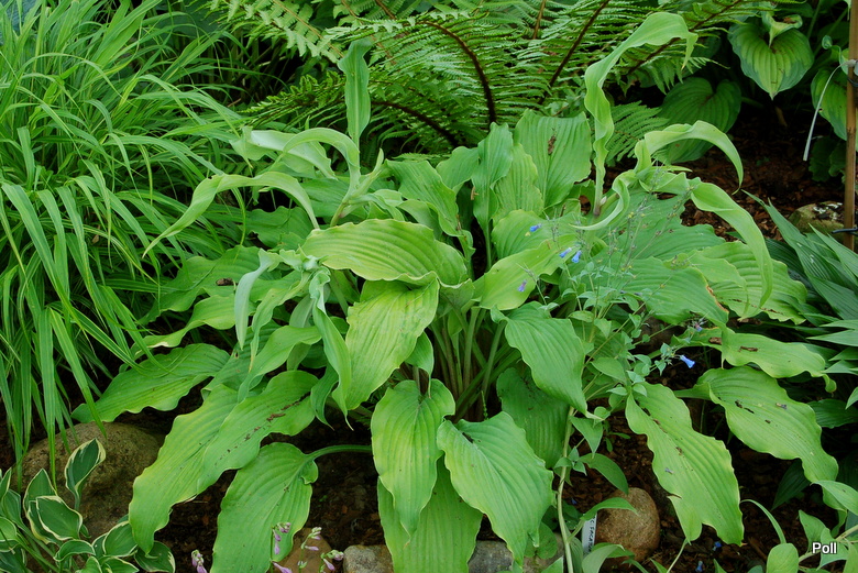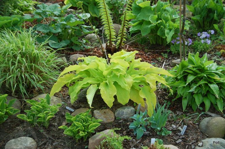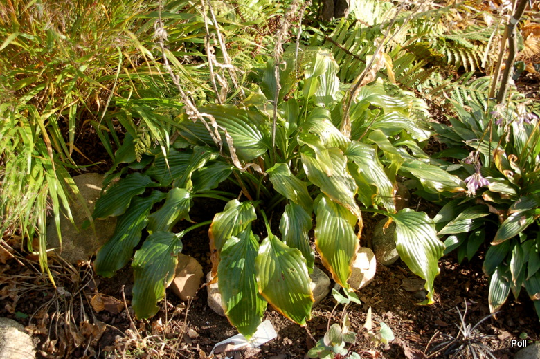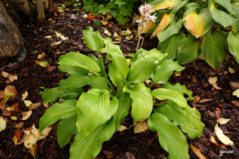 Rozmiar: M wysokość 30cm Liście: wiosną żółte, w trakcie sezonu zieleniejące; podłużne z wykręconymi czubkami; lekko pofalowane brzegi Kwiaty: jasno-lawendowe w sierpniu Zalecane stanowisko: od słońca do cienia Uwagi:
