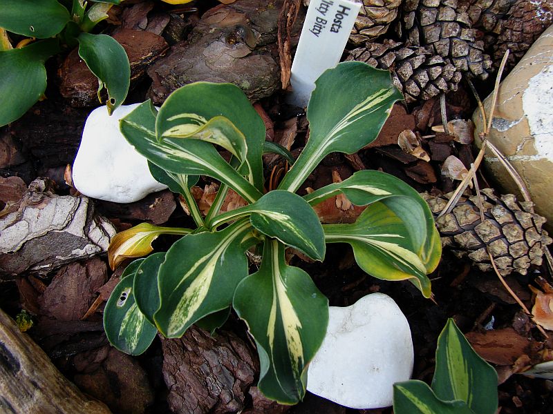 Liście: podłużne, lekko falowane, twarde... ciemnozielone z białym centrum przechodzącym na łodygi... centrum nie jest w pełni stabilne, latem potrafi przybierać formę streaked... również w jego obrębie mogę pojawiać się zielonkawe przebarwienia