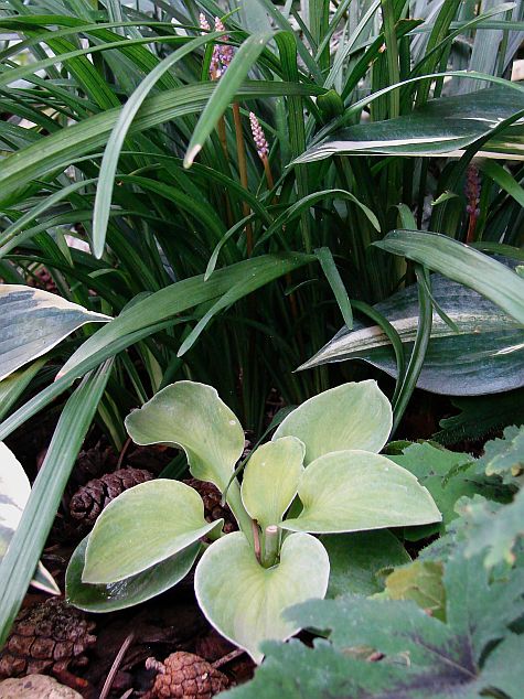 Rozmiar S Liście: okrągłe, lekko pofałdowane, masywne... początkowo szarozielone, w miarę wzrostu i w zależności od ilości światła stają się bardziej żółtawe Kwiaty: bladolawendowe Zalecane stanowisko: półcień/cień