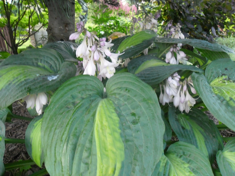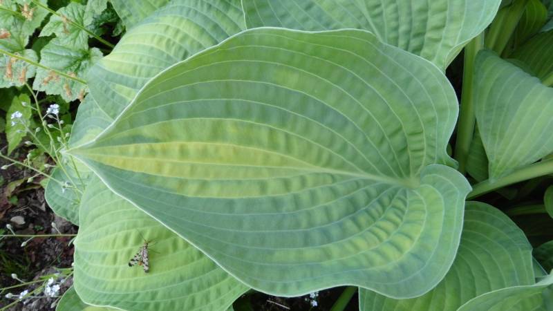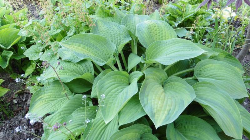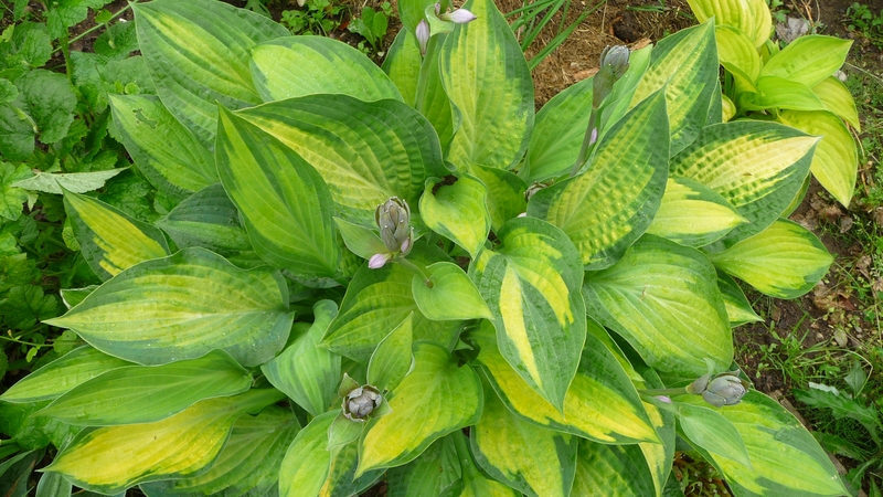 Młode liście mają kolor zielony z niebiesko zielonym marginesem, często w zależności gdzie rośnie ma nieregularne kolory na liściach, jedne są typowe inne mogą być całe zielone, młoda hosta ma liście pofalowane i ma krótsze łodygi,