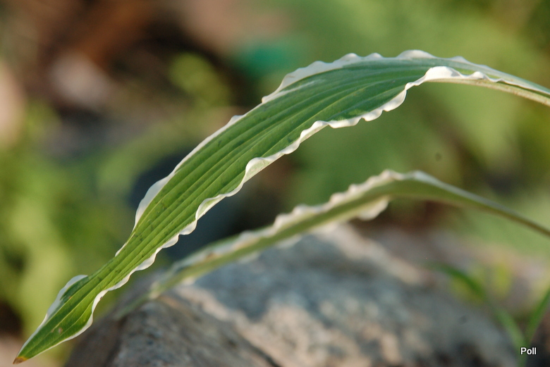 Liście: wąskie, wydłużone, zielone z mocno falującym białym marginesem, osadzone na czerwono nakrapianych ogonkach liściowych