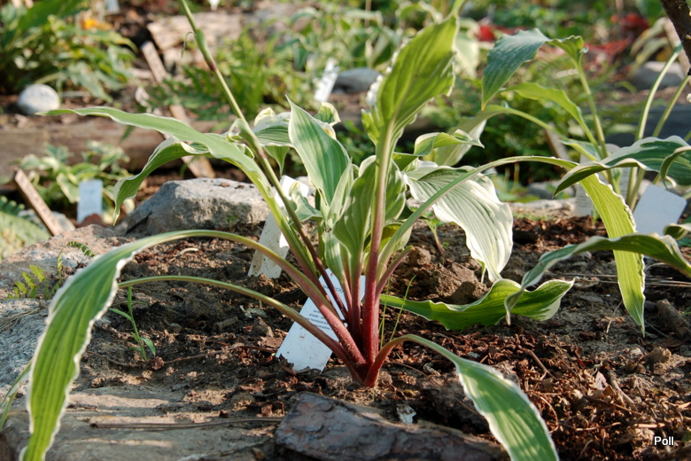 W sumie, prócz tego,że zapowiada się na łądną hostę z falbanką, nie umiem nic powiedzieć. U mnie rośnie drugi sezon a kupiona została w ubiegłym roku, jako jednokłowa sadzonka z in vitro. Spod spódniczki ładnie widać czerwone łodygi .
