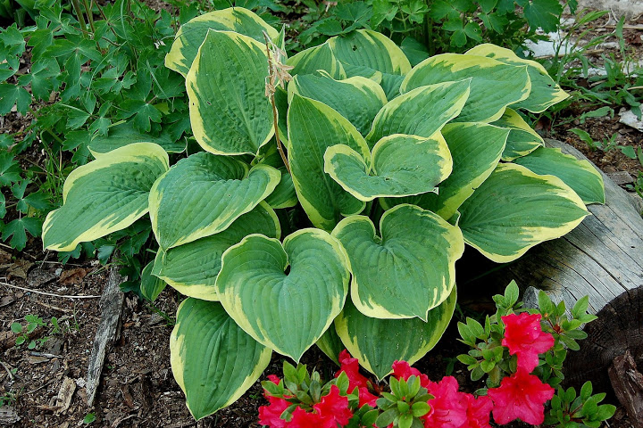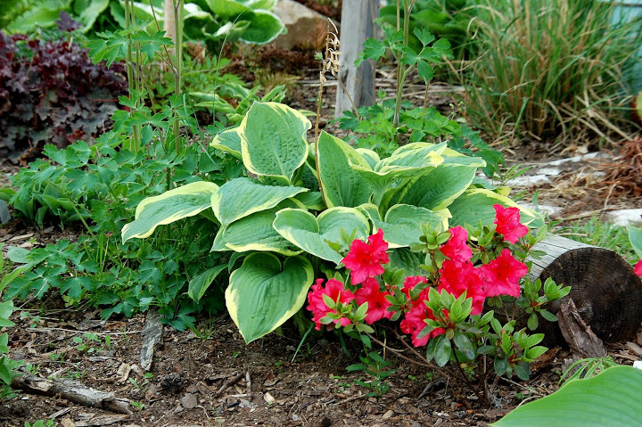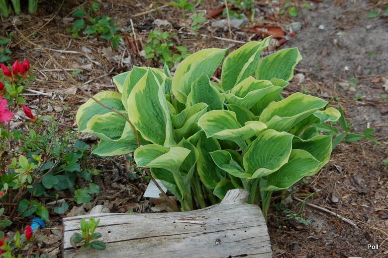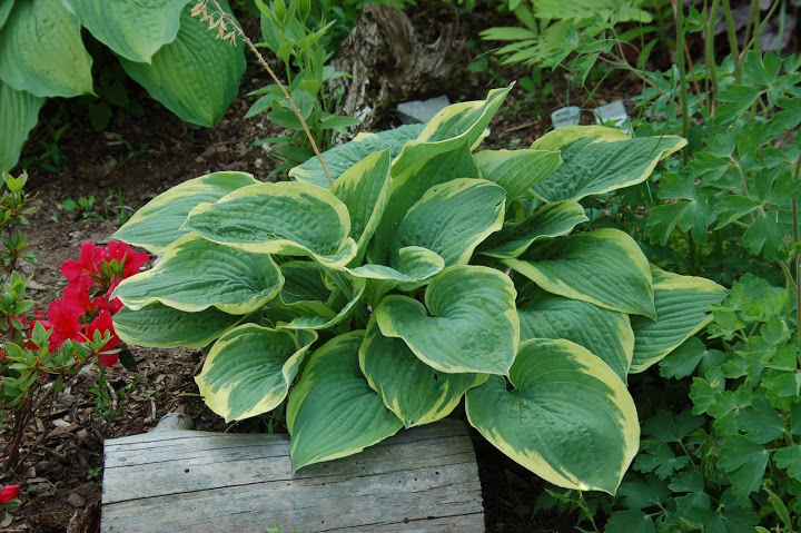 Hosta na zdjęciach ma 4 lata, ale prawdę powiedziawszy, niewiele mogę o niej napisać. Póki co, nie wyróżnia się niczym szczególnym.Wiosną liście mają nieo niebieskawą barwę, potem świetliście jasnozieloną a margines z żółtawego, robi się stopniowo jasniejszy. Na poprzednim stanowisku, które było zbyt słoneczne, margines nie wybarwiał się równomiernie, czego nie znoszę. Przeniosłam więc ją na bardziej cieniste , jak widać prezentuje się lepiej. Jeśli ma pokazać jakieś niezauważone przeze mnie cechy, powinna była to zrobić w ubiegłym roku - był to jej 5ty sezon, więc najwyższy czas. Póki co, odnotowałam ładną symetryczność sercowatych liści, które robią się nieco burchlaste. Jej nazwa "Sea Beacon" oznacza latarnię morską, wskazywałoby to, iż powinna 'świecić' wśród host, przyciągać wzrok kolorem.