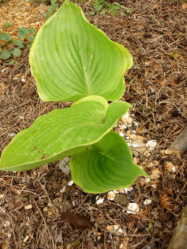 Wystarczyła jedna deszczowa noc i ślimaki rozpoczęły swoje dzieło. Zaczęłam się martwić, bo niebieskie granulki rozsypane, a hosta zjedzona... Czyżby były aż tak mądre?