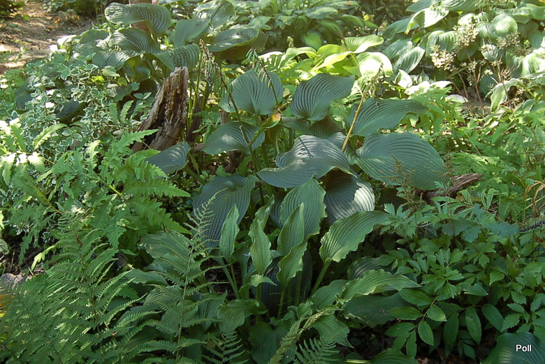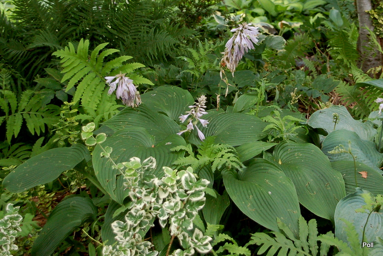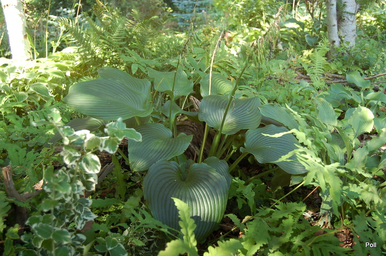 Rozmiar L wysokość 80-100cm Liście: podłużnosercowate, duże, świetnej substancji; ciemnozielone, falujace brzegiem; back przypudrowany Kwiaty: jasnolawendowe, niemal białe (VI/VII) Zalecane stanowisko: niezbyt gorace; co najmniej półcień