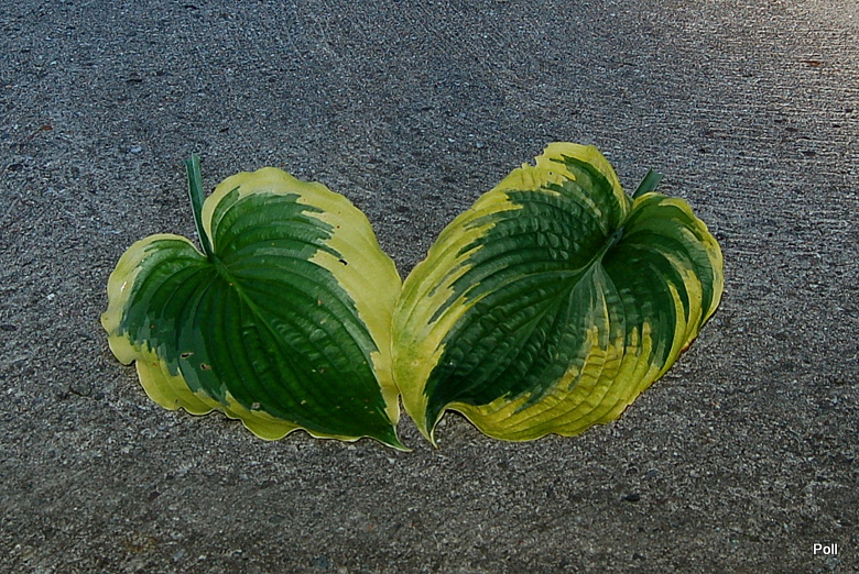 Mireczka pięknie to wytłumaczyła, dokładnie tak jest. :slonko Dodam tylko,ze kolorowe nacieki marginesu The King, wlewają się głębiej w centrum liścia a on sam jest mocniejszy - chciałoby się napisać 'bardziej męski - i ma wyraźne burchle. Zerwałam po jednym liściu z obu host (najbardziej zniszczone :lol: ), podobnej wielkości i zdobiłam kilka fotek:
