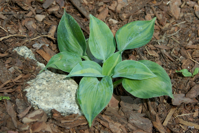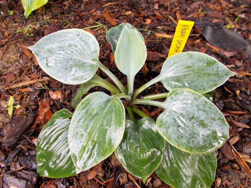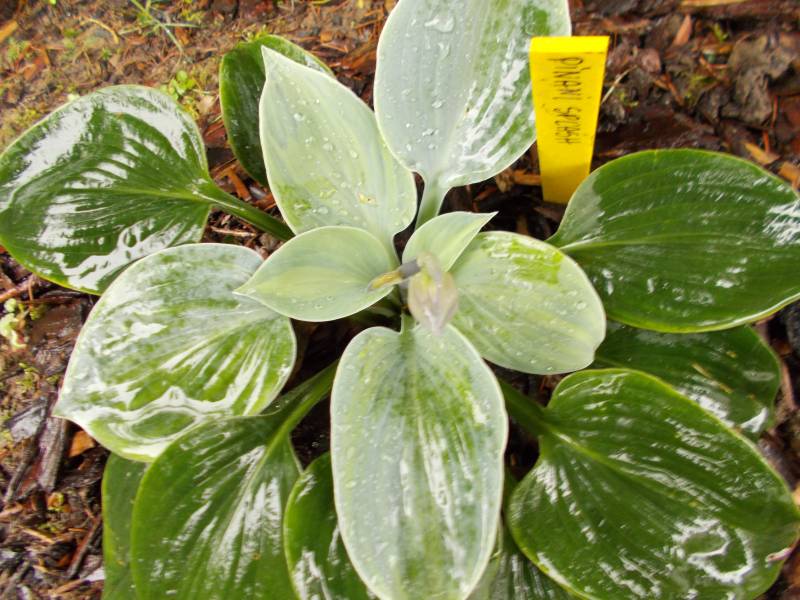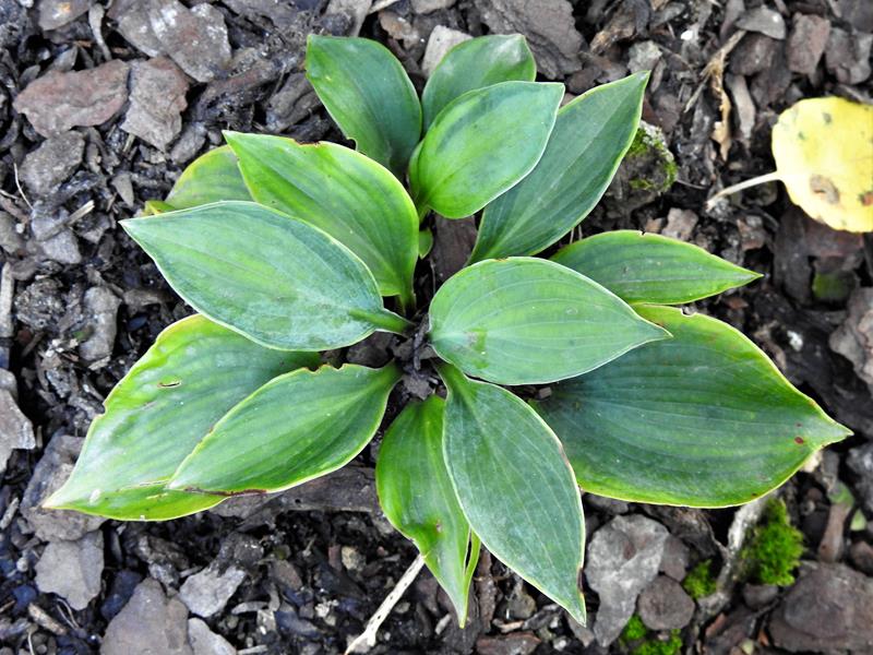 Liście: twarde, okrągłe z ostrym , lekko skręconym czubeczkiem; żółtawo-zielone centrum otoczone nieregularnym, intensywnie niebieskim marginesem, który miejscami spływa aż do centralnego nerwu