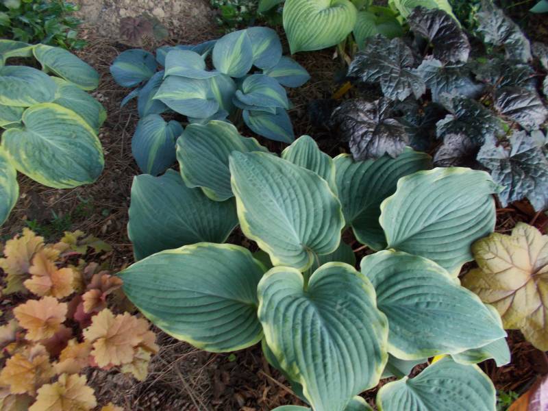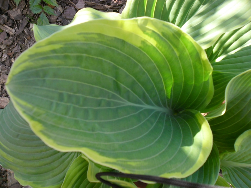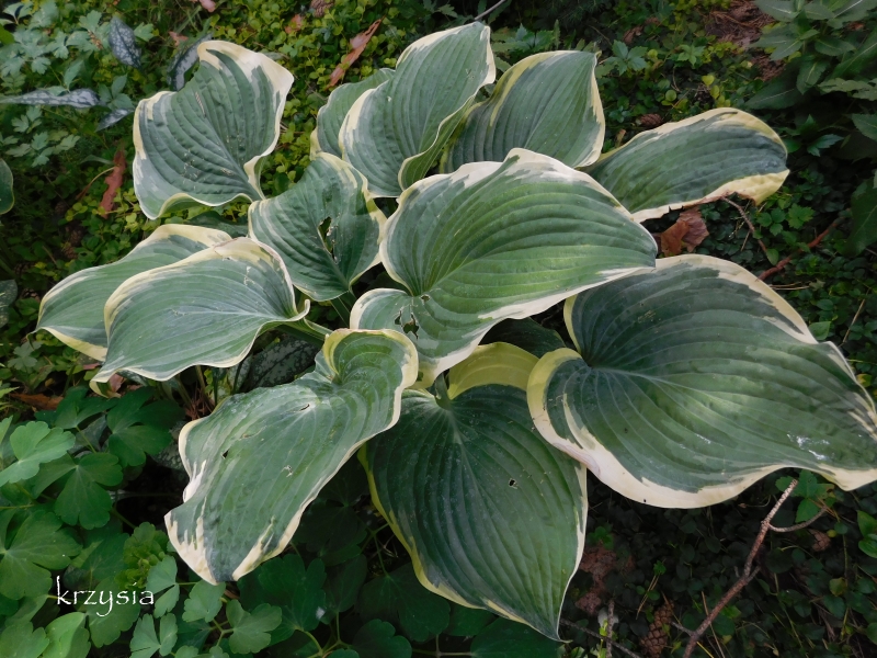 Liście: sztywne, duże (ponad 30 cm długości), sercowate; wiosną niebieskozielone z jasnozielonym , dośc wąskim, ale rozlewającym się w głąb liścia marginesem; w sezonie centrum staje się błyszczace, zielone a brzeg wyżółca się ; dobra substancja z lekkimi burchlami