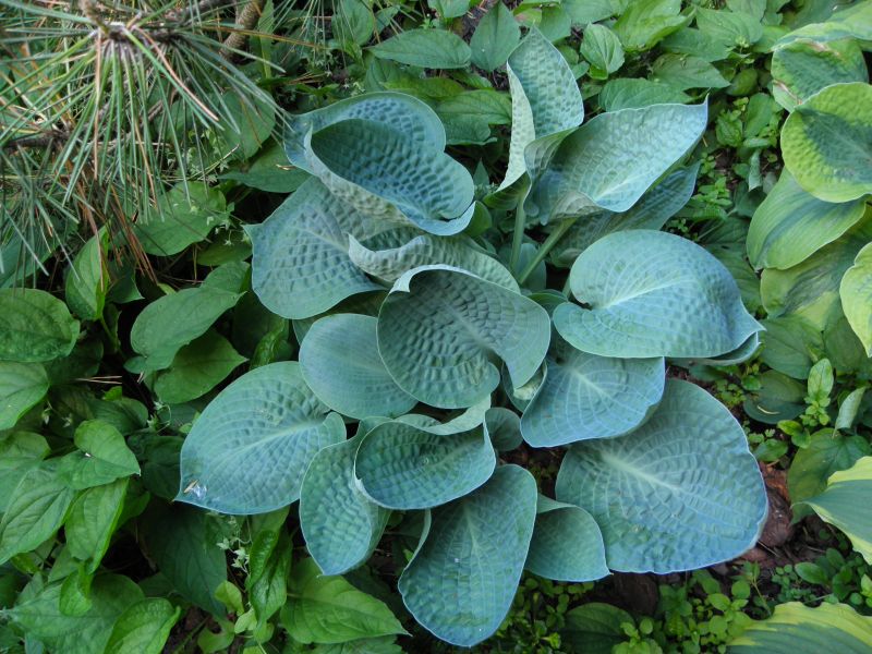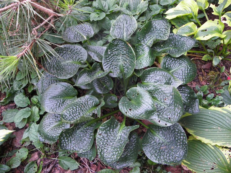 Hosta Deep Blue Sea na mocno cienistym, wilgotnym stanowisku - piekny błekitny kolor i mocne burchle w gratisie
