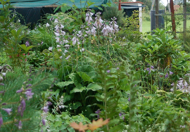 Rozmiar: L (60-70 cm) Liście: grube, w sezonie ciemnozielone, niemal okrągłe o średnicy ok.25 cm ; mocno burchlaste z falującym brzegiem Kwiaty: lawendowe (VII/VIII) , w pąkach niemal fioletowe Stanowisko: od półcienia