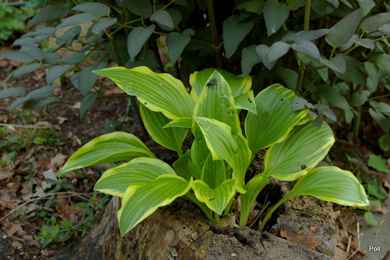 Hosta Bold Ribbons na najstarszym hostowisku, wraz z innymi roślinami cienia
