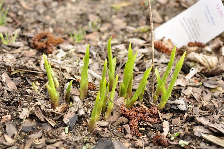 Obrana z przemarzniętych liści, spryskana środkami przeciwgrzybowymi, hosta Maya Tritone rozpoczyna kwitnienie