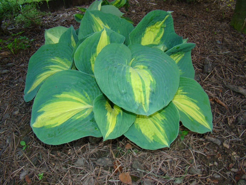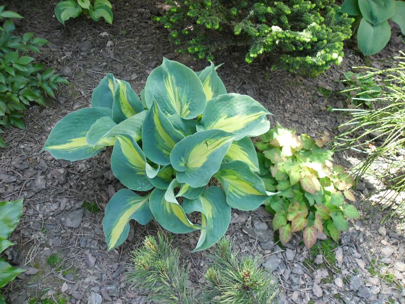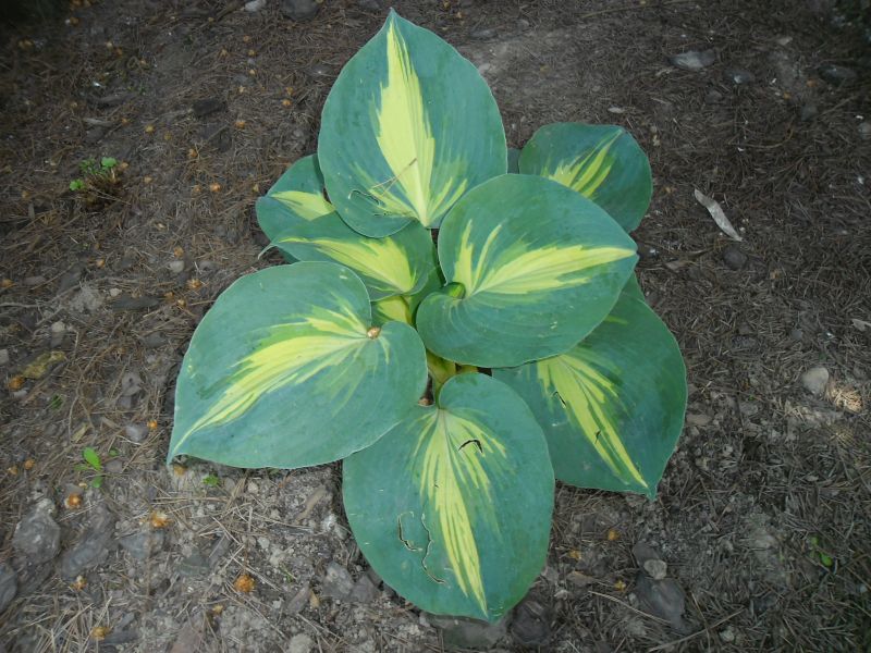 Liście: niemal okrągłe, ale ostro zakończone, niebiesko zielone z wąskim kremowym centrum; wiosną barwy sa bardziej nasycone - centrum jest żółtawe a margines niebieskoturkusowy