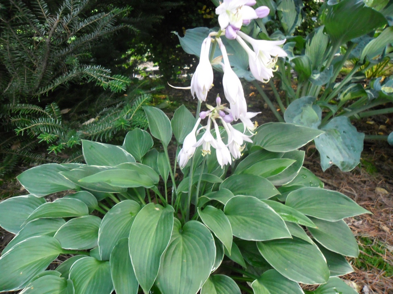 Rozmiar: M wysokość 35-45cm Liście: zielone, z bardzo wąskim kremowo białym marginesem Kwiaty: lawendowe, kwitnie lipiec/sierpień Zalecane stanowisko: półcień do cienia