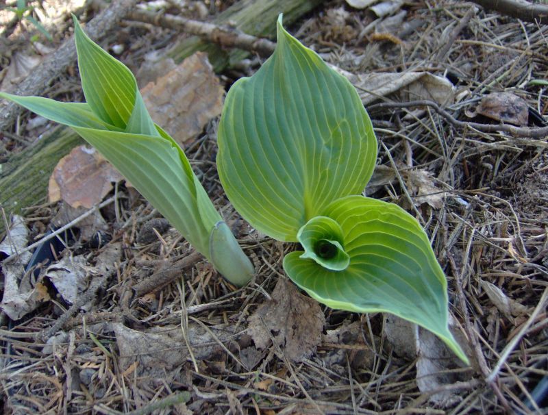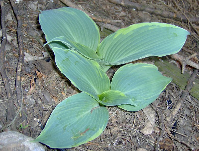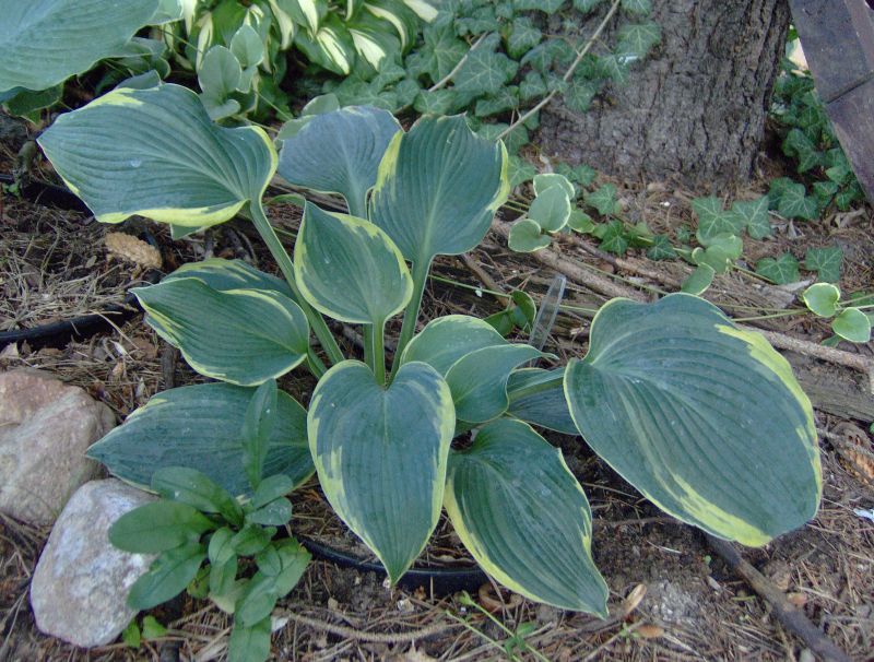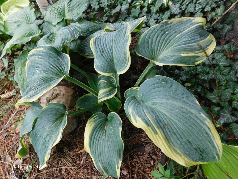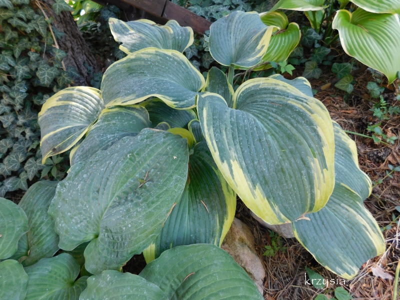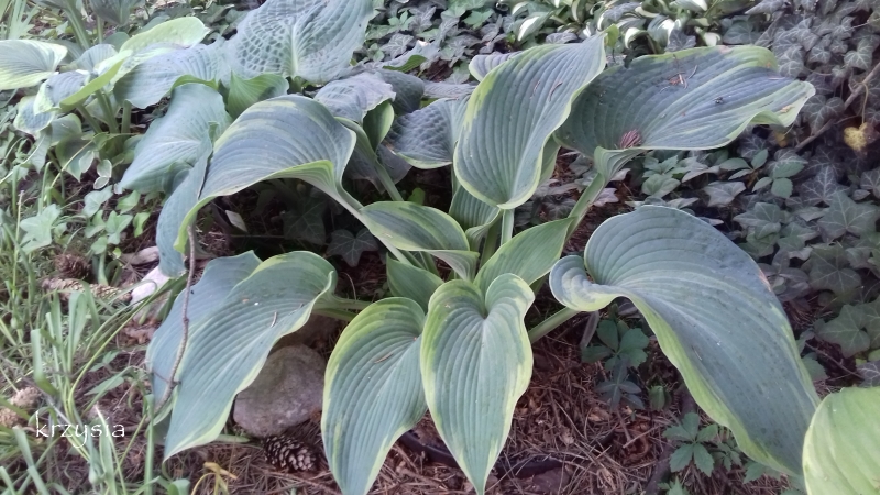Rozmiar: XL wysokość 80-100cm Liście: duże niebiesko zielone z żółtym marginesem, latem jaśniejącym Kwiaty: jasno lawendowe Zalecane stanowisko: półcień/cień,