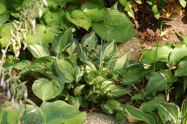 Rozmiar: M wysokość 40-45cm Liście: centrum liścia białe z mozaiką zieleni w różnych odcieniach, margines ciemno zielony, szeroki, nieregularny Kwiaty: lawendowe, kwitnie w lipcu i sierpniu Zalecane stanowisko: półcień do cienia
