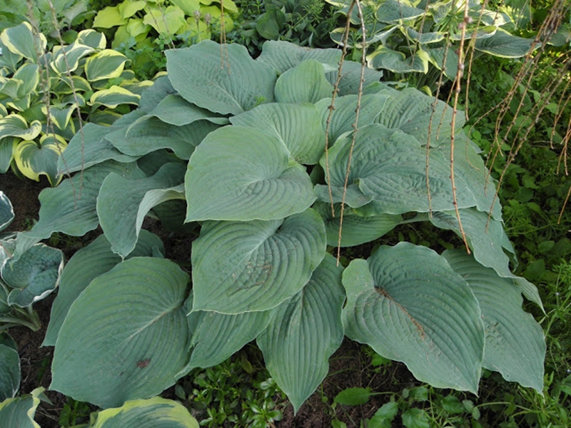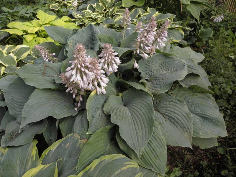 Rozmiar: G 85-90 cm wysokości Liście: duże rozmiarowo, mocnej substancji; niebieskoszare ( w trakcie sezonu szarozielone) z dobrze widocznymi nerwami, lekko falujące Kwiaty: prawie białe, kwitnie czerwiec/lipiec Zalecane stanowisko: półcień do cienia
