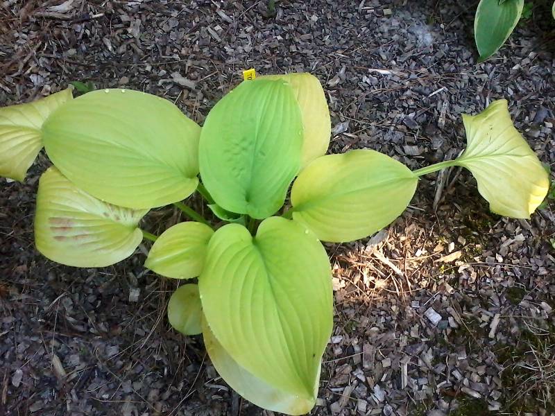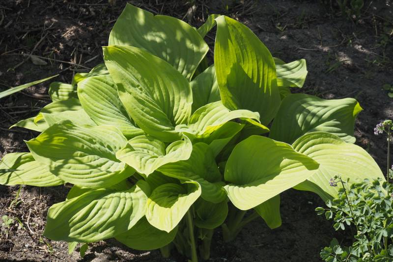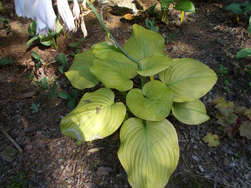 Hosta Tortilla Chip rośnie u mnie pod dereniem Satomi, słońca ma tam całkiem sporo. Latem liście robią się żółtawe, ale tak delikatnie ... i to mnie trochę zastanawia