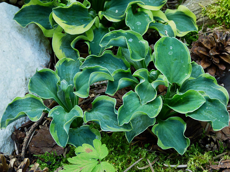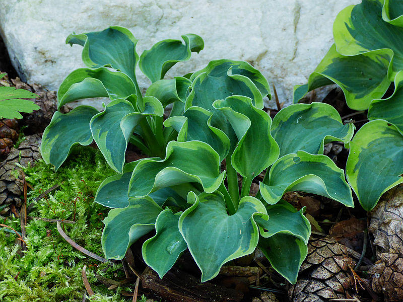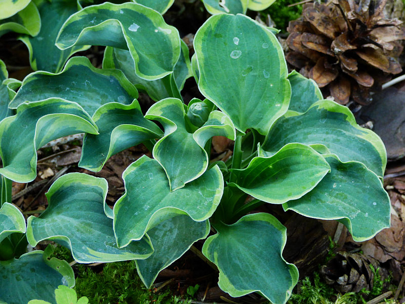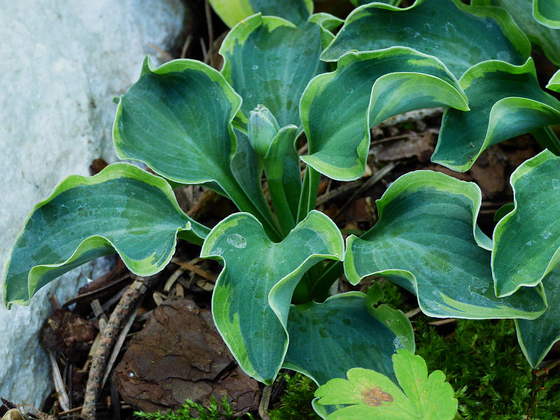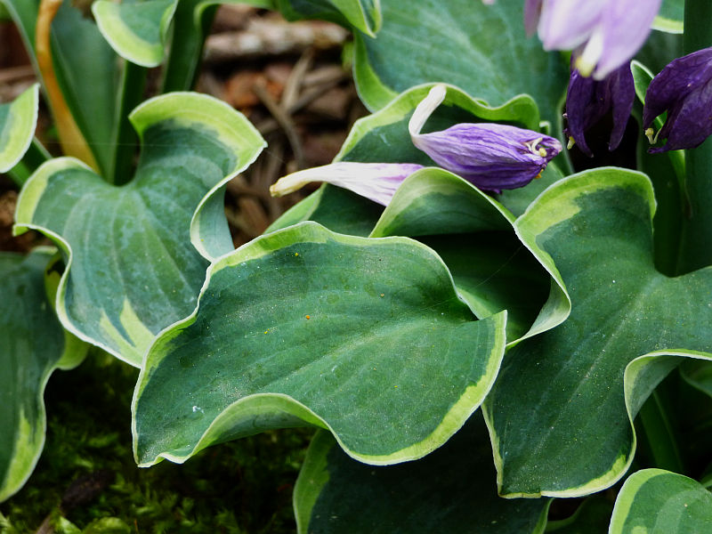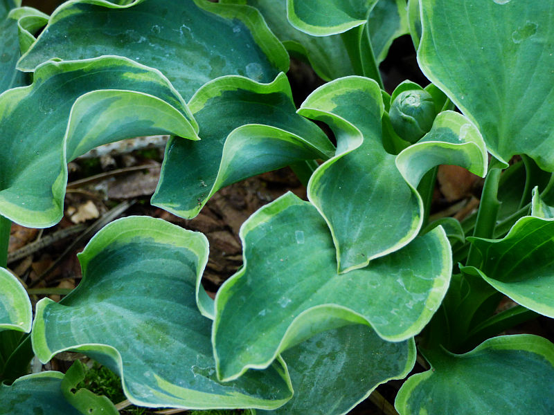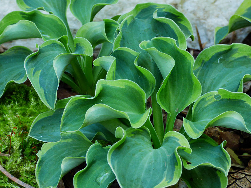 Liście: okrągłe... niebieskozielone z nieregularnymi szarozielonymi smugami oraz szerokim i pofalowanym, zielonkawożółtym marginesem, zmieniającym w trakcie sezonu kolor na kremowy
