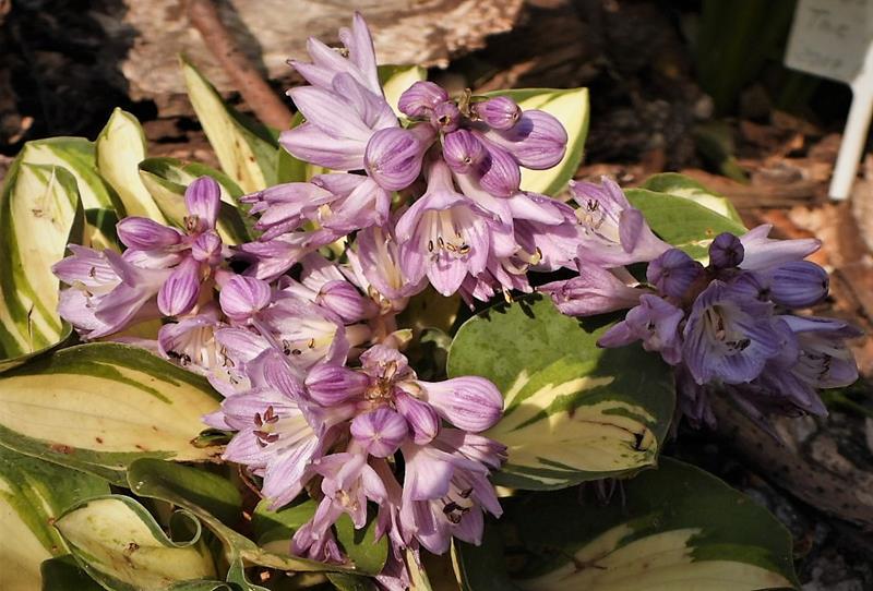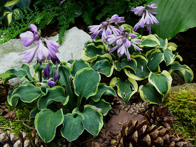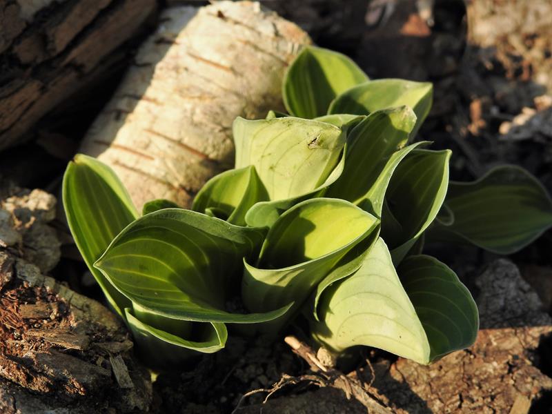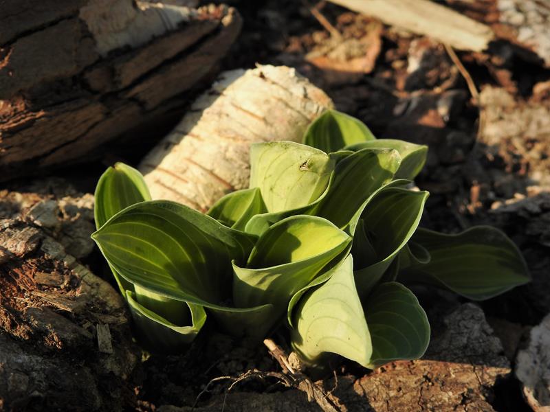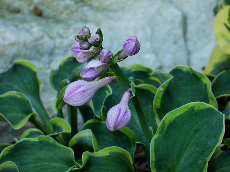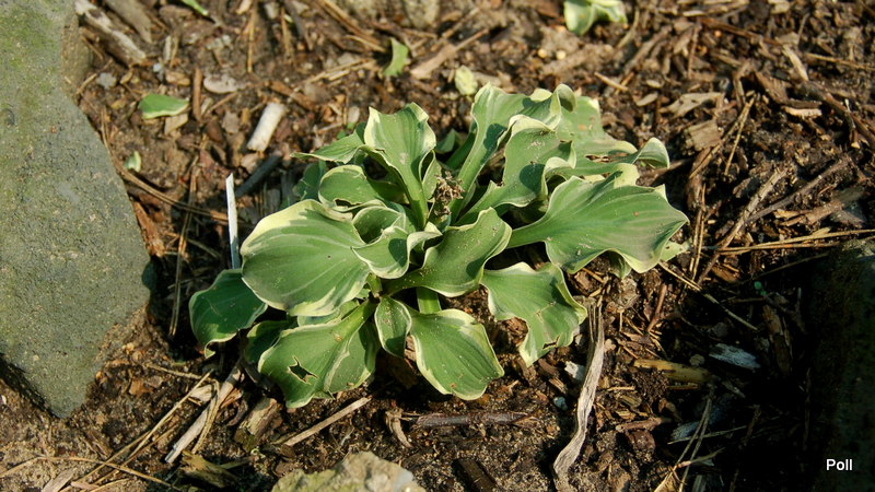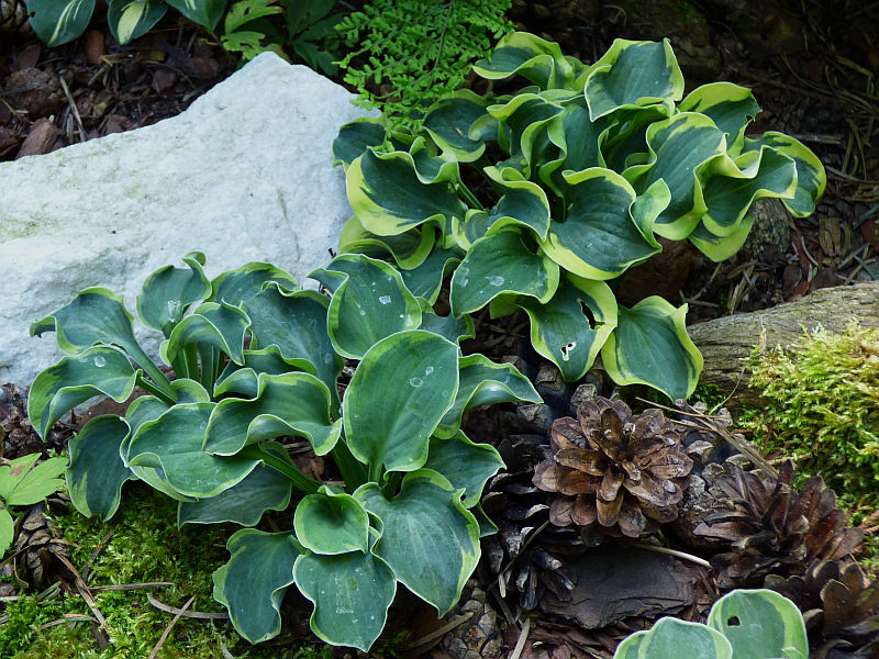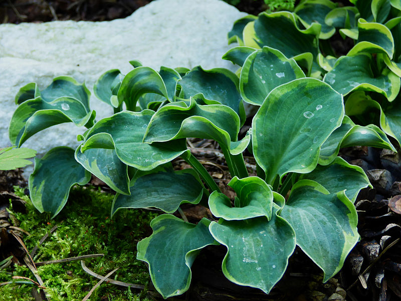 Liście: okrągłe... niebieskozielone z nieregularnymi szarozielonymi smugami oraz szerokim i pofalowanym, zielonkawożółtym marginesem, zmieniającym w trakcie sezonu kolor na kremowy