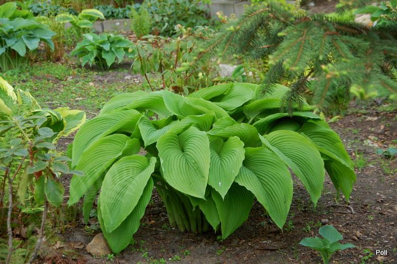 Rozmiar: XL wysokość 100-120cm Liście: zielone, w kształcie serca, Kwiaty: prawie białe, kwitnie czerwiec/lipiec Zalecane stanowisko: półcień do cienia