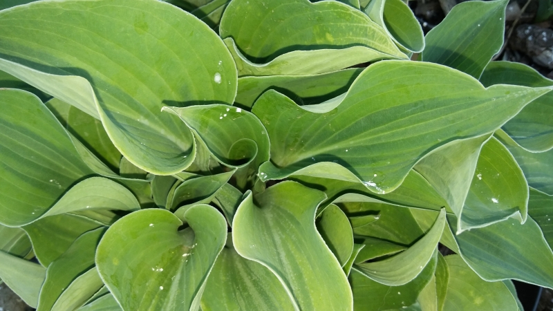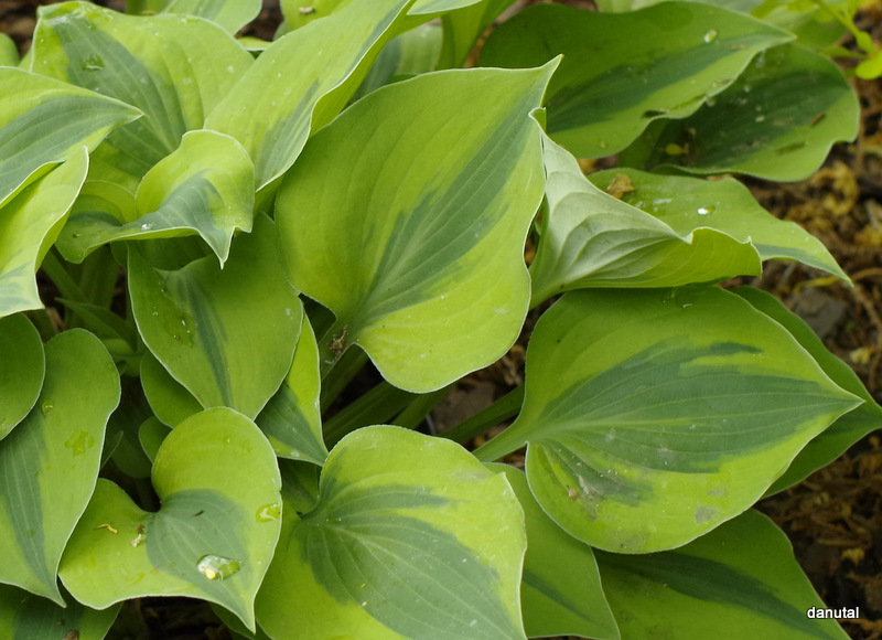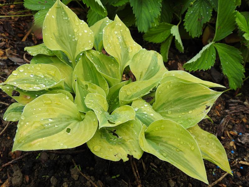Mimo deszczowej pogody i zimna, hosta Luna Moth jest w doskonałej formie.
