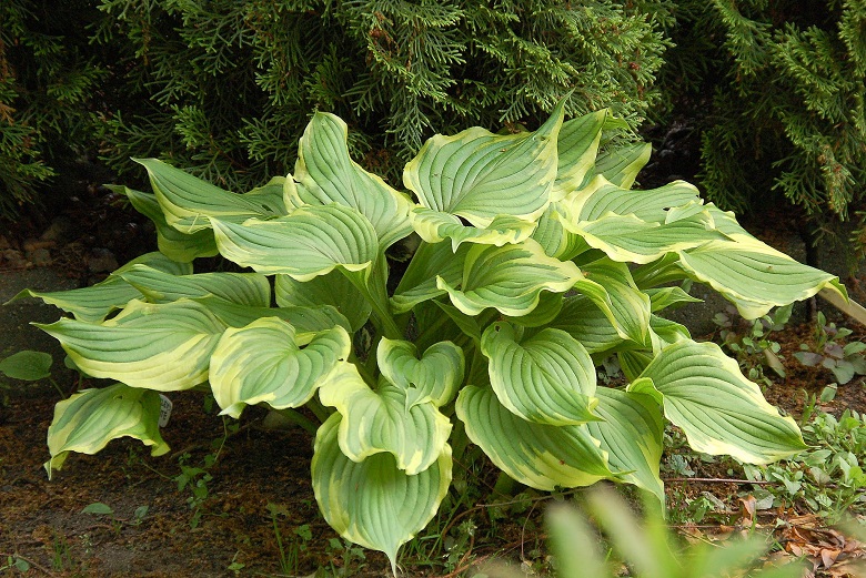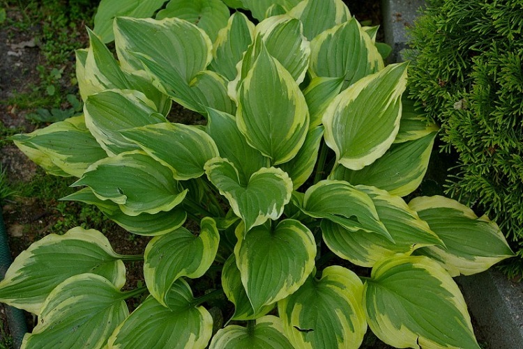 Liście: sercowate, lśniące , dość miękkie; ciemnozielone centrum otoczone żółtawym, bielejącym w trakcie sezonu , nieregularnym marginesem