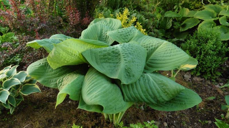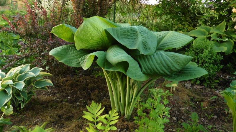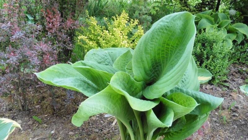 Hosta Blue Umbrellas po starciu wiosennego, matowego pudru, staje sie ciemna i błyszczaca