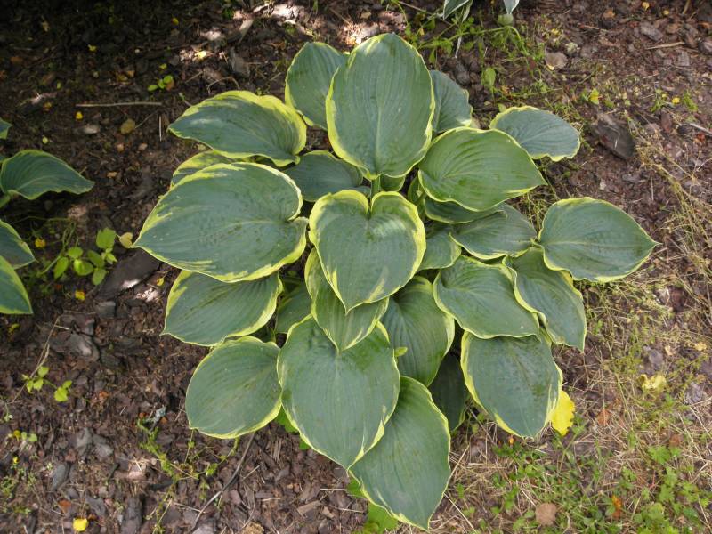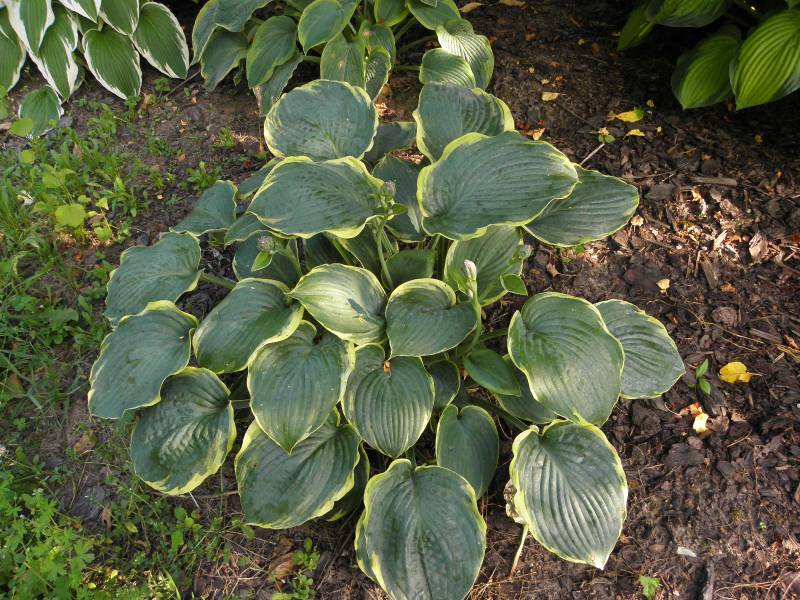 Liście: okrągło-sercowate, duże, ciężkie o dobrej substancji; wiosną pokryte niebieskim nalotem, w sezonie stają się lśniące, ciemne - zielononiebieskie, otoczone kremowym, falującym marginesem; u starszych osobników widoczne są lekkie burchle
