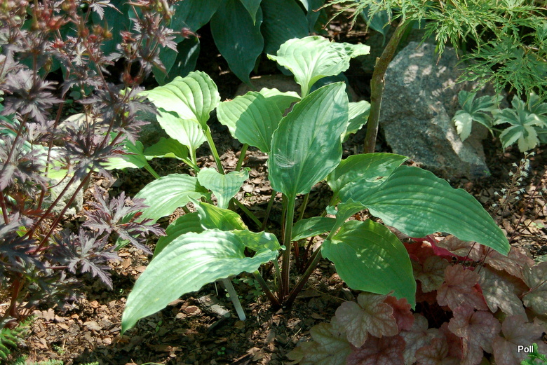 Rozmiar: L wysokość 55cm Liście: zielono-szare, wydłużone, z mocno falowanym brzegiem, wydatnym żyłkowaniem i białawym tyłem liścia; początkowa część łodyżek liściowych czerwona. Kwiaty: jasnolawendowe, kwitnie od połowy lipca Zalecane stanowisko: półcień, cień
