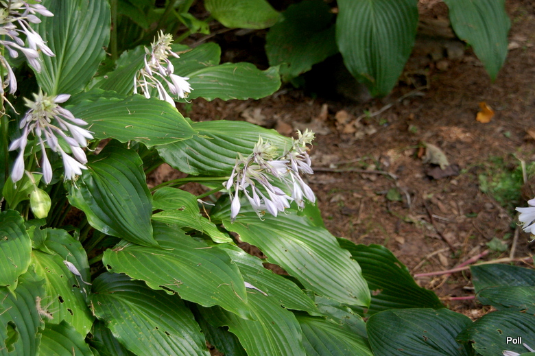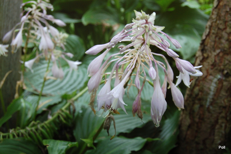 Kwiaty - jak na hostę - bardzo ładne: szeroko rozwarte z płatkami wywiniętymi nieco w górę. W opisie jest napisane, iż są lawendowe, bo takie wrażenie sprawiają, w rzeczywistości mają kolor biały, przyciemniony jasnolawendowym, szerokim pasem. Są dość długie, trąbkowate a przez to delikatne .