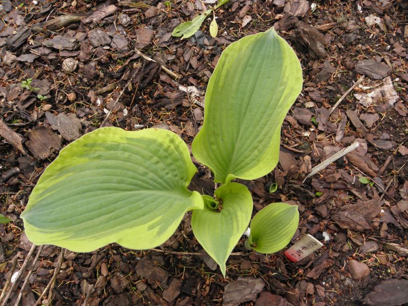 Rozmiar: L wys.60-70cm; szer.ok.100cm Liście: talerzowate, niebiesko-zielone z żółtym marginesem Kwiaty: lawendowe Zalecane stanowisko: półcień do cienia