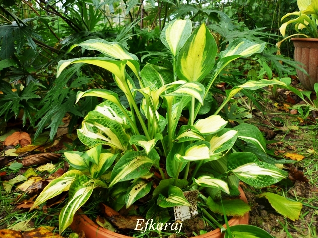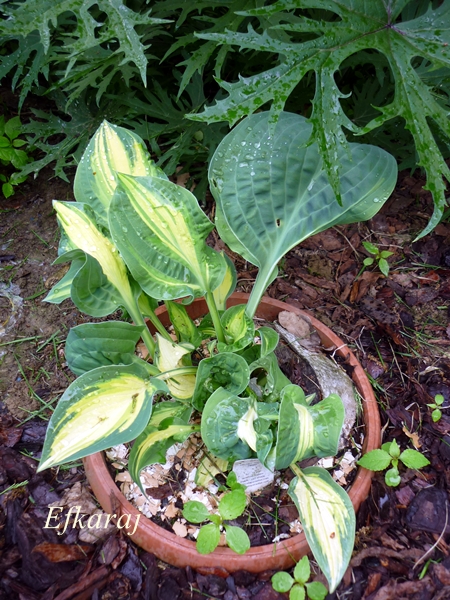 Obiecana fotka Happy Dayz Chwalić się nie ma czym, mało tego...Normalnie mnie denerwuje Nie wiem, jak rośnie u innych miłośników host, ale jak widać na naszym przykładzie - Ewci i moim - to hosta, którą trudno ogarnąć. Kupiona trzy lata temu u Fransena, jako 1-kłowa sadzonka z in vitro.
