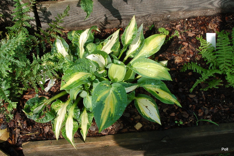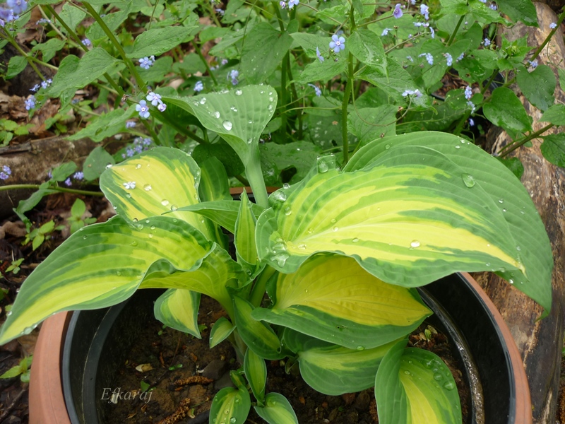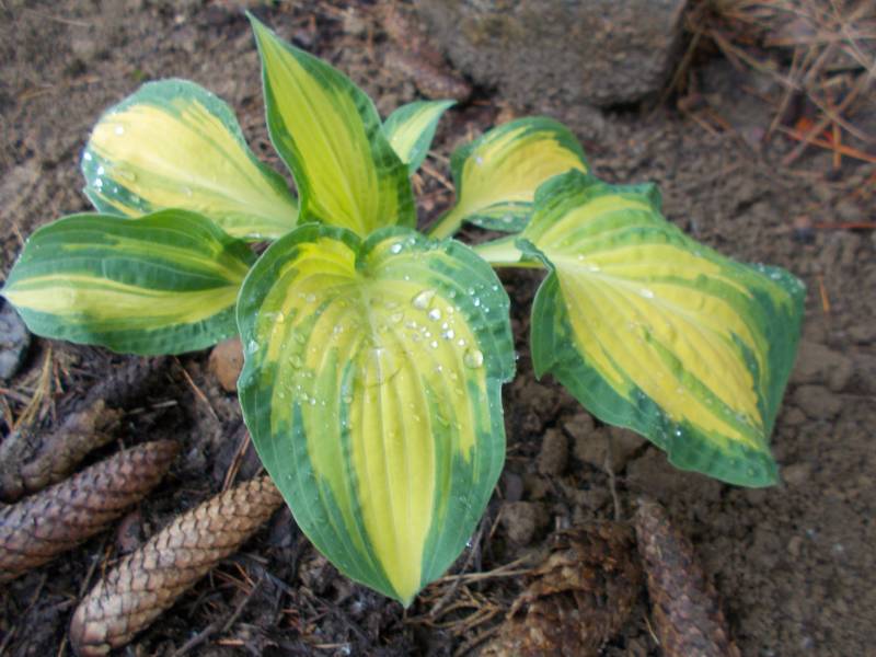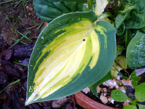 W pełni hostowego sezonu stwierdzam, że jest to najbardziej zwariowana hosta w moim ogrodzie Zwariowana, w pozytywnym tego słowa znaczeniu. Liście... każdy nadal inny. Inaczej układają się kolory. Nie ma tu sztampowego w opisie marginesu, czy wypełnienia jakimś konkretnym kolorem środka. Wielkość liści jakby z kilku różnych host. Do tego część liści jest ładnie układająca się, a część radośnie powykręcana w różnych kierunkach. Jeszcze nie osiągnęła rozmiaru M. To taki rozczochrany, radosny maluch