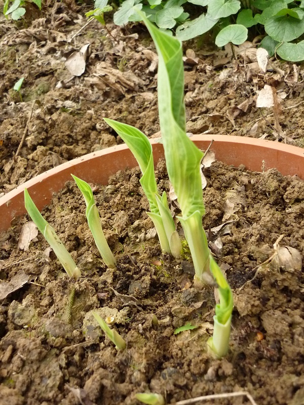 Zaczyna drugi sezon w moim ogrodzie i od razu niespodzianka. Jeden liść dużo większy i cały zielony, wyrasta z kła, z którego wyrastają kolorowe liście.