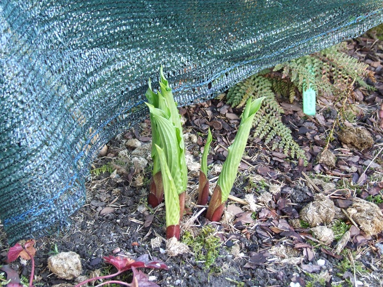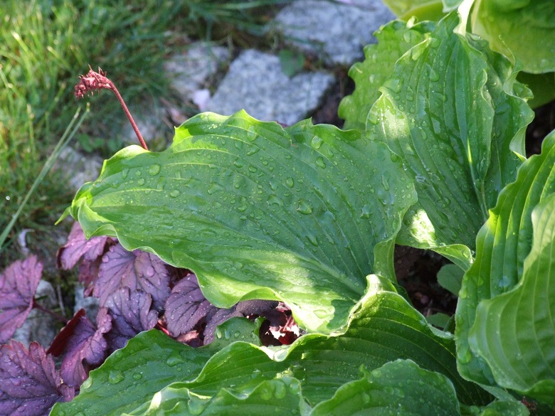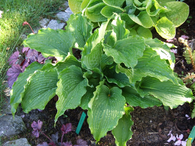 Clovelly, to jedna z host, które podzieliłam i przeniosłam na naturalnie wilgotne stanowisko. Niestety, wypadło mi z głowy, że ona stosunkowo wcześnie staruje i nie dałam jej miejsca w całorocznym cieniu. Obie kępy z podziału ucierpiały od przymrozków, ale jedna do tego stopnia, ze wycięłam jej wszystkie kły. Drugą - te ze zdjęcia - tylko obrałam z przemrożonych liści.