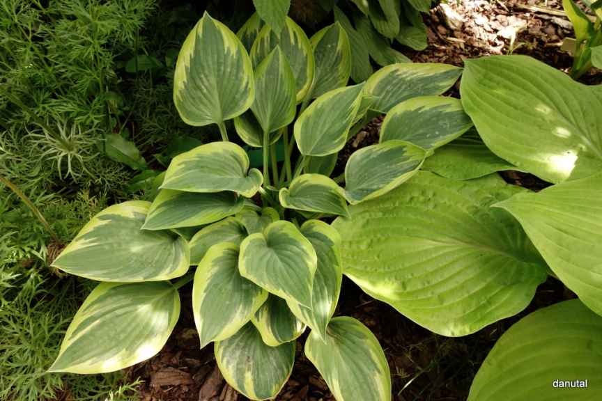 Rozmiar: M wysokość 30-35cm. Liście: sercowate,szaro-zielone z nieregularnym żółtym marginesem Kwiaty: jasno-lawendowe Zalecane stanowisko: półcień Uwagi: