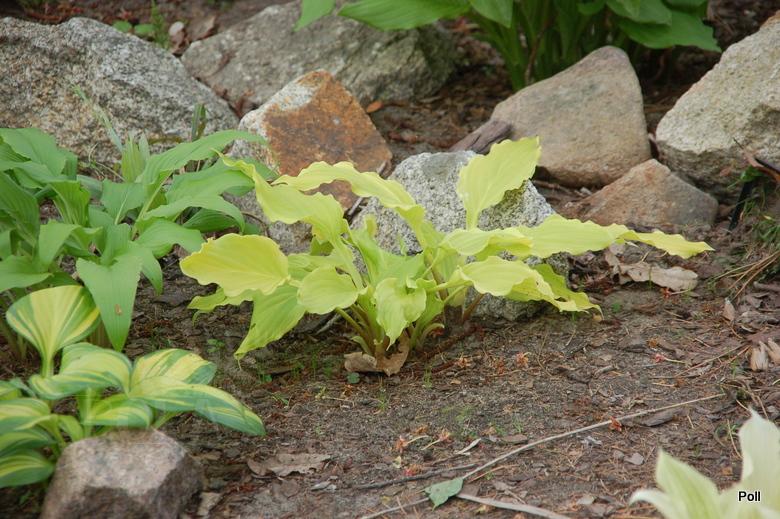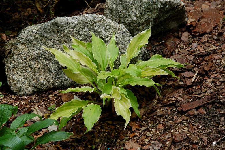 Hosta Gila River...Kiedyś na jasnym stanowisku była mała i jasna, więc po dyskusji z Madzią i Elą, przeniosłam ją do bardzo mocnego, wilgotnego cienia. Teraz jest dla odmiany...mała i jasna 2smiech